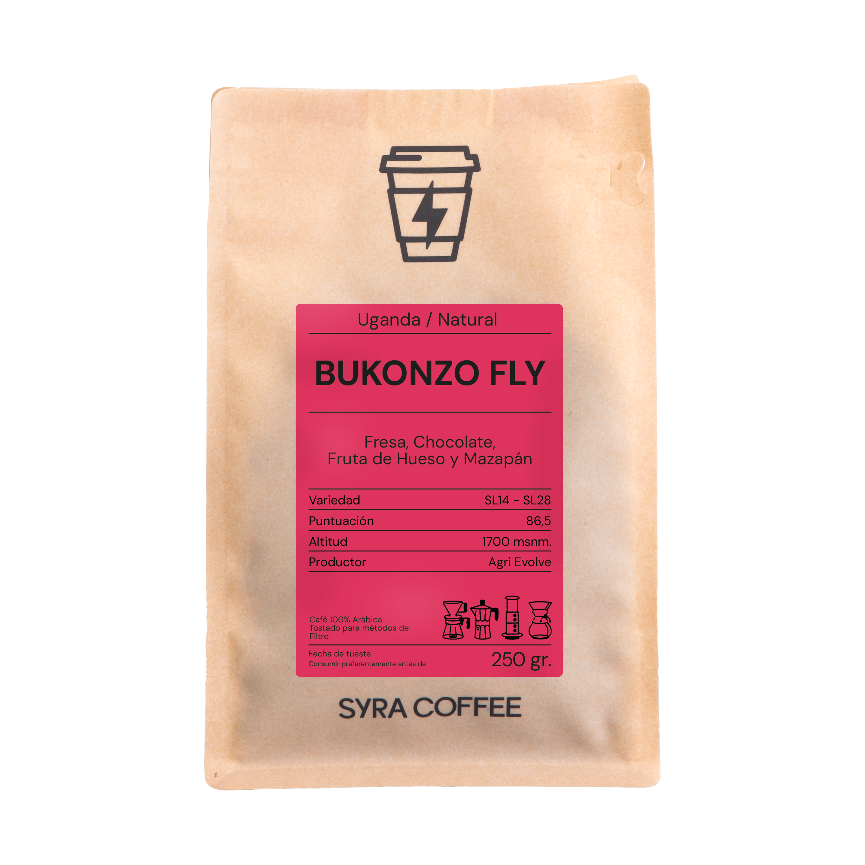 Este lote está compuesto por las variedades SL14 y SL28, conocidas por su estructura y capacidad para desarrollar perfiles complejos en procesos naturales. Tras la cosecha manual, las cerezas se secan cuidadosamente para potenciar la fermentación controlada, dando lugar a un perfil frutal y profundo, con mayor intensidad que la edición anterior de Bukonzo Fly.