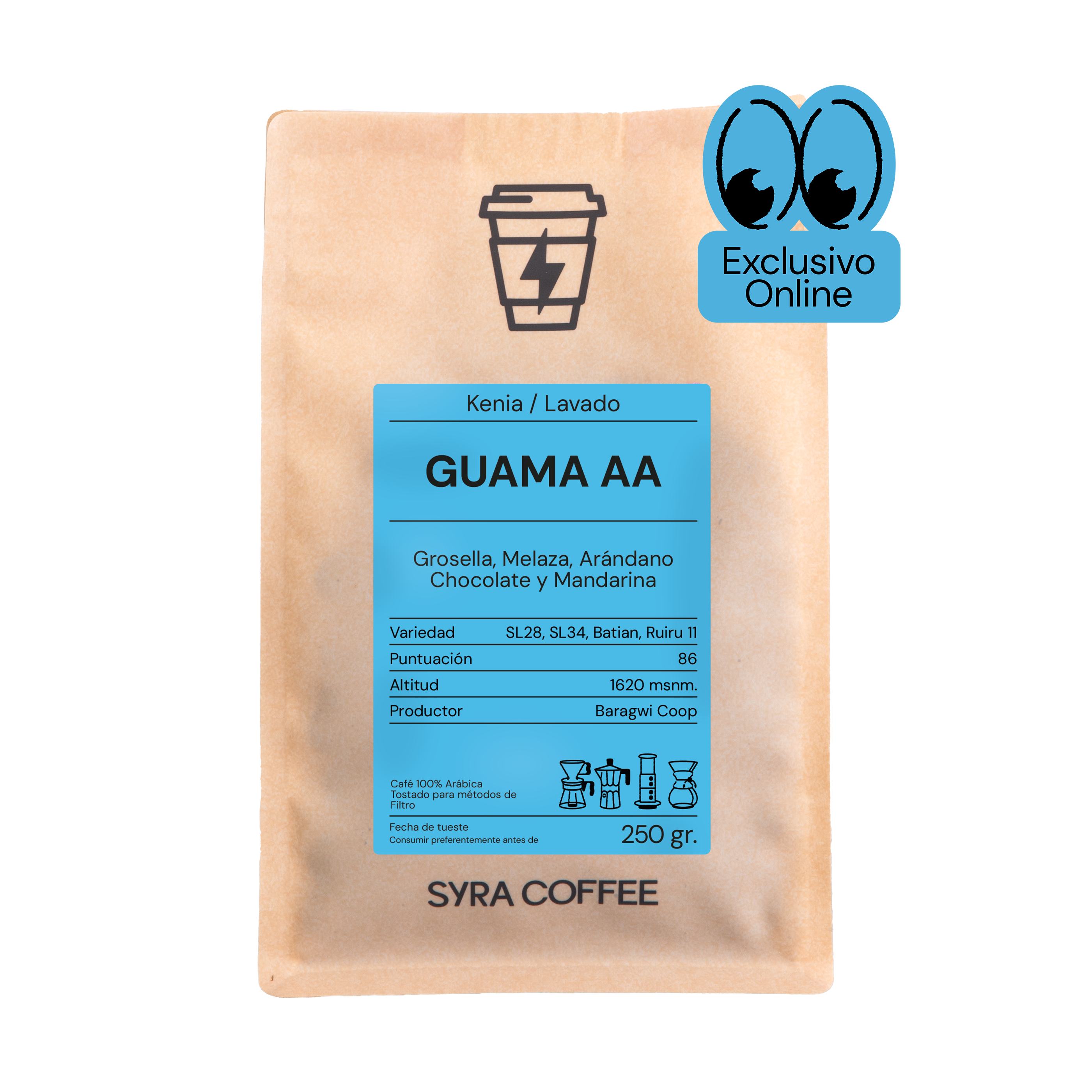 En el perfil sensorial, Guama AA expresa el carácter clásico keniano con una lectura profunda y equilibrada. Destacan notas de grosella y arándano rojo, seguidas por matices cítricos de mandarina que aportan frescura y tensión. La melaza y el chocolate añaden densidad y dulzor, construyendo una textura de cuerpo medio-alto y sensación envolvente. Con acidez media y puntuación de 86, este café tostado para filtro ofrece claridad, complejidad y un final persistente.