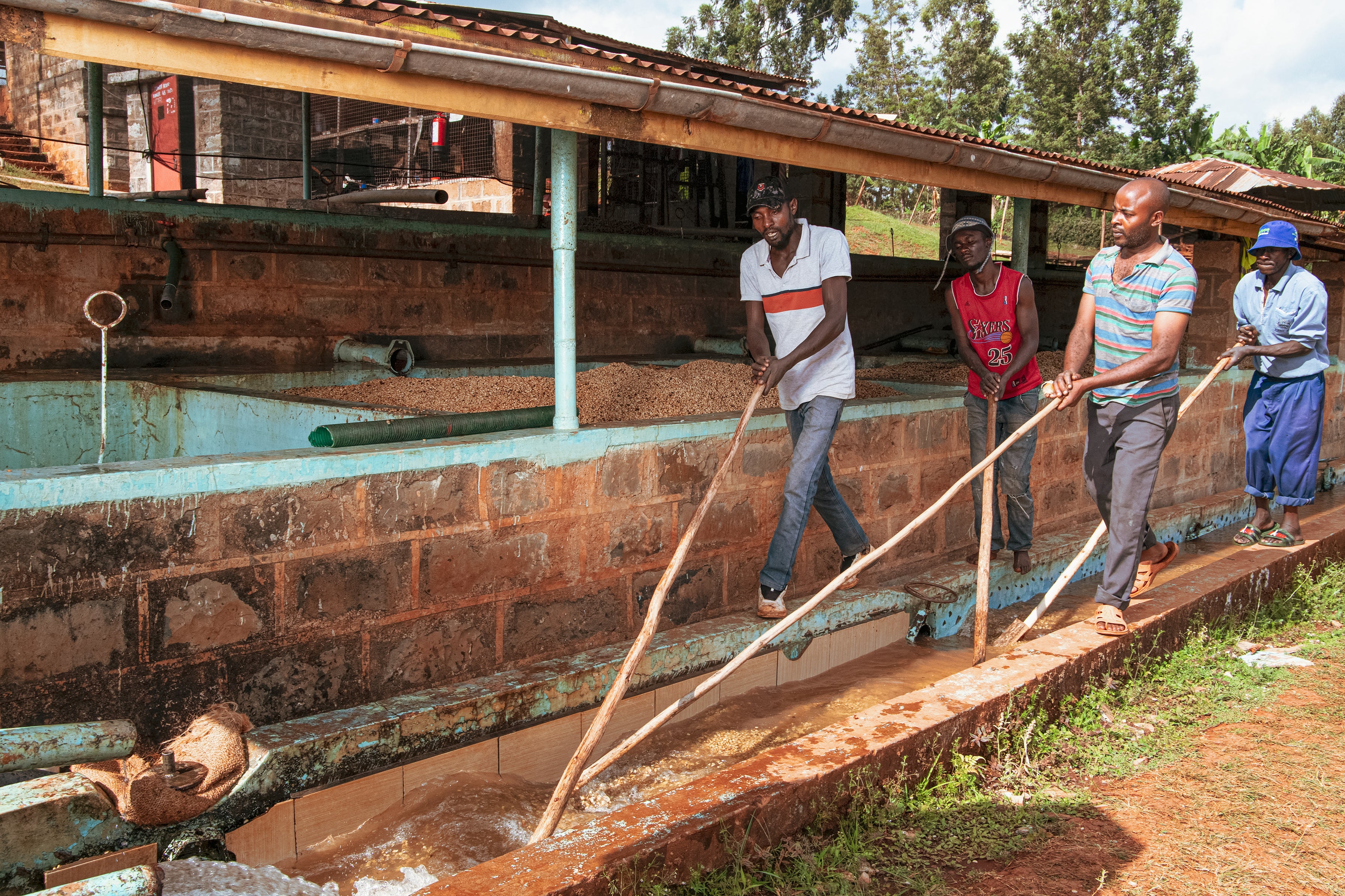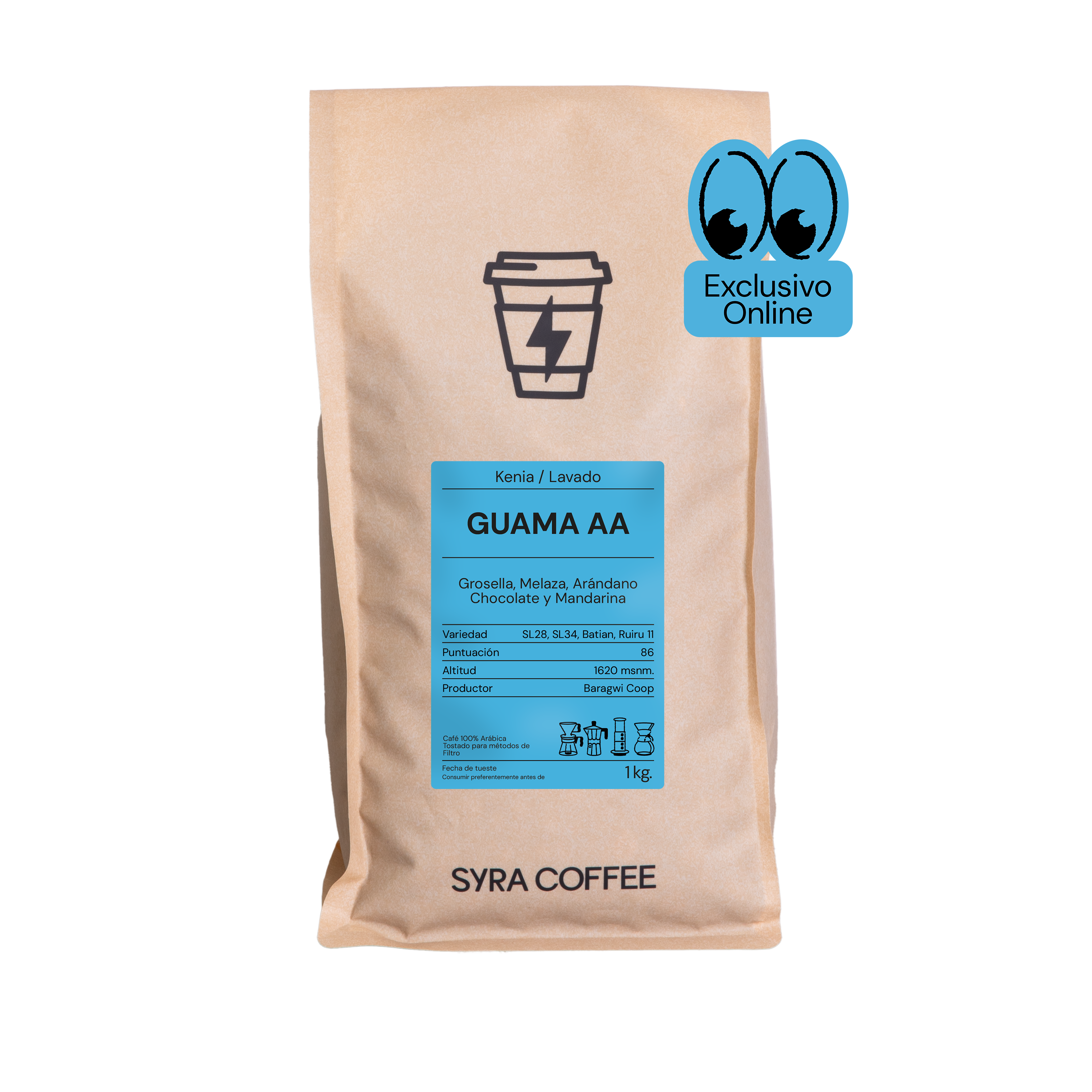 Las condiciones de suelos volcánicos, clima templado y cosecha manual selectiva permiten desarrollar granos densos y complejos. Guama AA está compuesto por SL28, SL34, Batian y Ruiru 11, combinando variedades históricas de Kenia con otras más resistentes que garantizan estabilidad y continuidad productiva. Tras la recolección en su punto óptimo de maduración, las cerezas son despulpadas, fermentadas y lavadas cuidadosamente antes de un secado controlado que preserva pureza y estructura en taza.