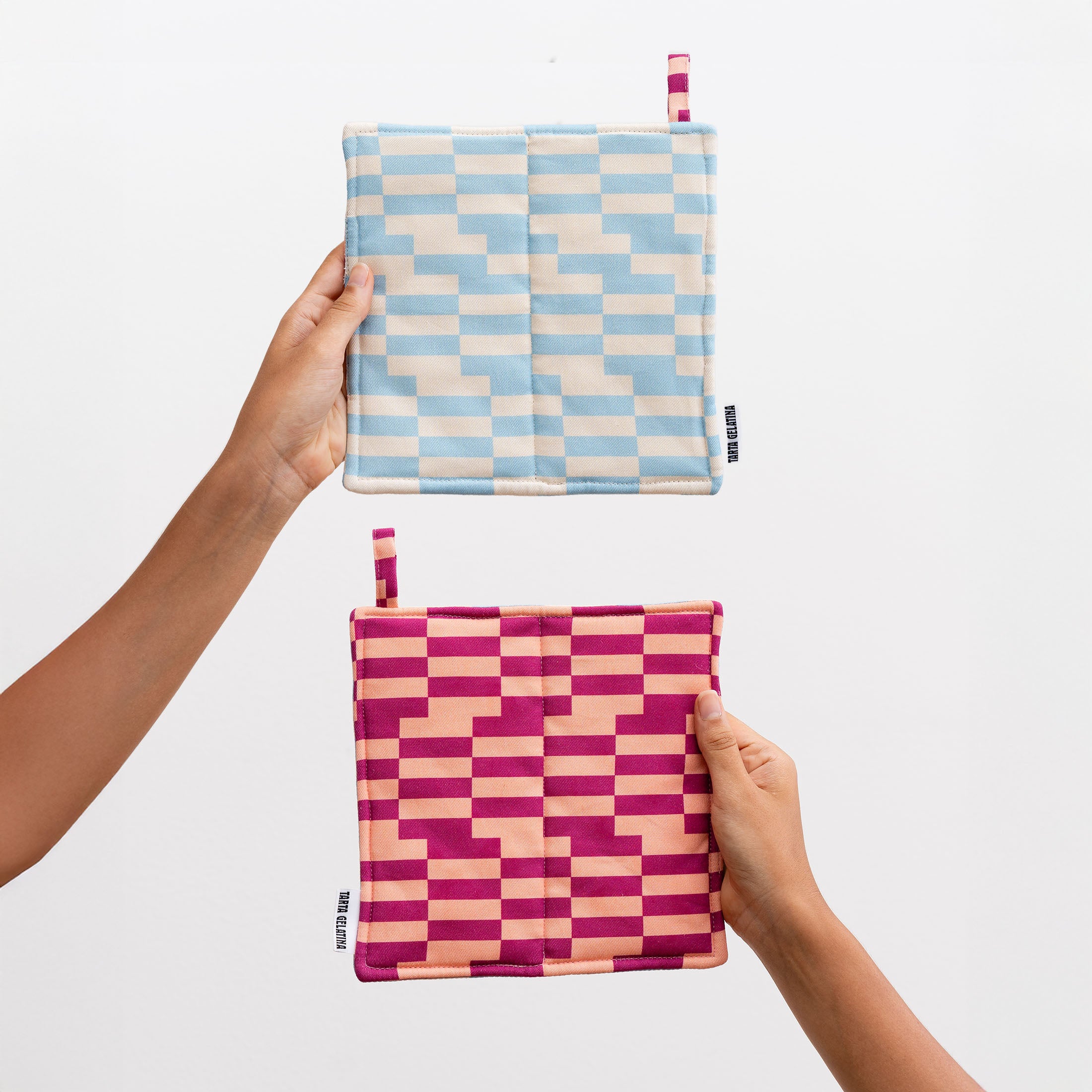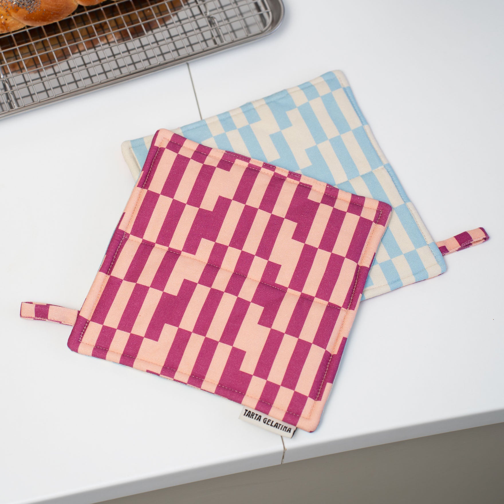 Tarta Gelatina Pot Holder: Un salvamanteles acolchado de diseño reversible, con un color diferente en cada cara, pensado para proteger la mesa y sumar un punto de estilo al momento del café. Incluye una práctica presilla para colgarlo y está confeccionado íntegramente en algodón orgánico 100%, tanto por dentro como por fuera. Hecho a mano con cuidado, es ese detalle sencillo que convierte lo cotidiano en algo especial.