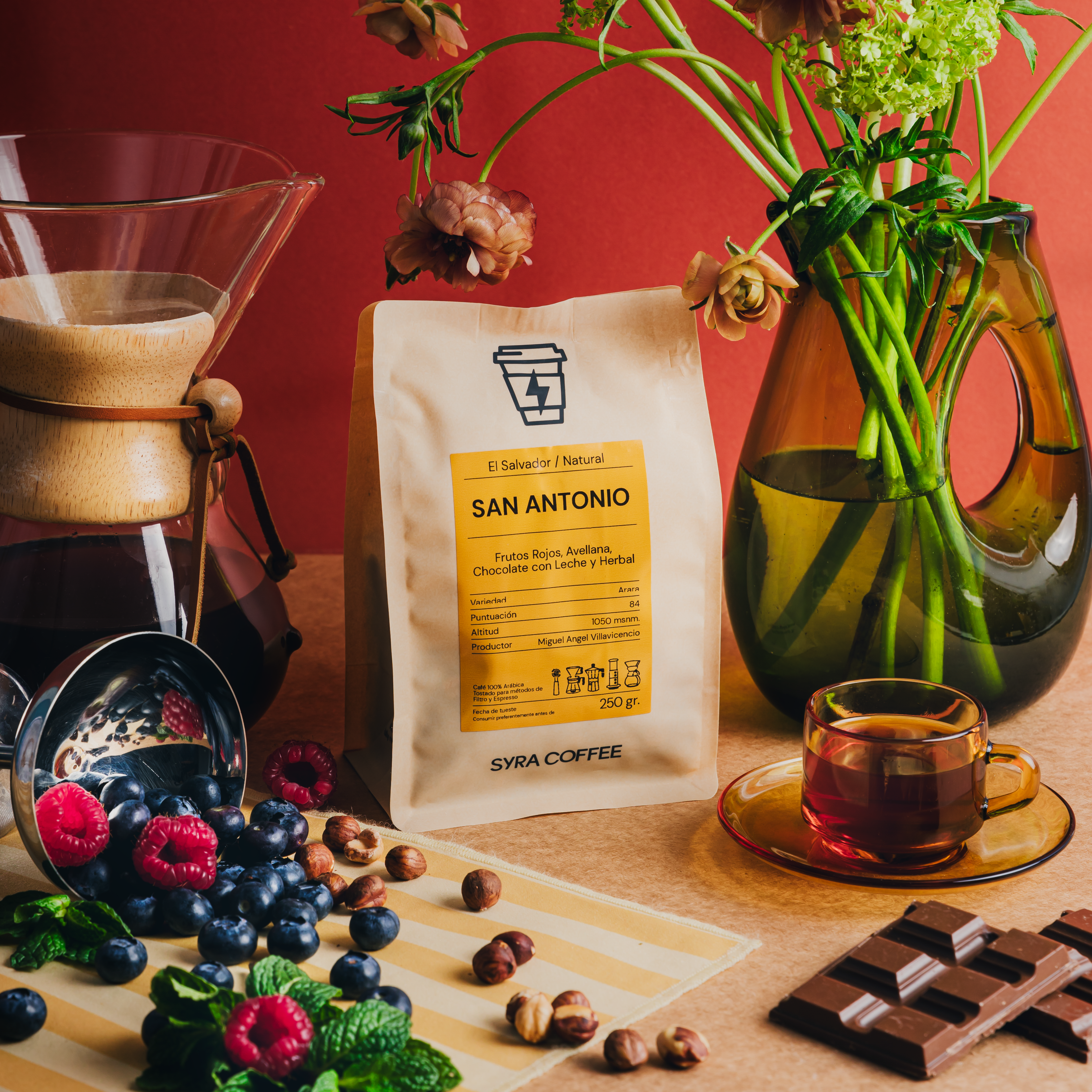 En taza, San Antonio presenta un perfil frutal, con notas de frutos rojos, chocolate con leche, avellana y matices herbales que aportan frescura y complejidad. Tiene un cuerpo medio y una acidez media a media-ligera, ofreciendo una experiencia equilibrada y accesible, con una puntuación de cata de 84 puntos. Su tueste omni lo hace versátil tanto para espresso como para métodos de filtro, adaptándose bien a distintos estilos de preparación.